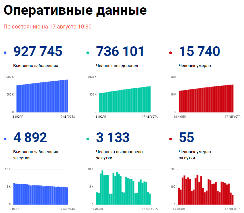 截至8月17日北京时间15:30,俄罗斯新增确诊病例4892例,新增治愈病例3133例,新增死亡病例55例,累计确诊病例927745例,累计治愈736101例,累计死亡病例15740例。